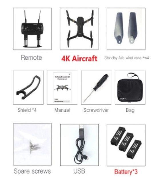 Function: Up/down, Forward/backward, Turn left/right, Sideward flight, 3-level flight speed, LED Light, Headless Mode, One Key Automatic Return, Altitude Hold Mode, WiFi FPV