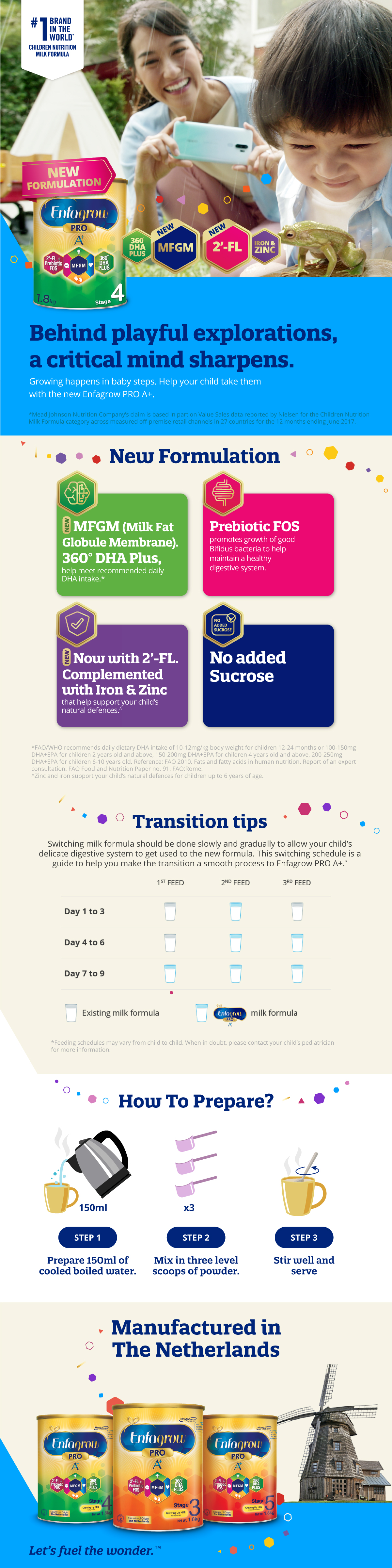 • With over 100 years of experience in pediatric nutrition, Mead Johnson Nutrition has scientifically formulated Enfagrow Pro A+ Stage 4 with a unique blend of nutrients that are important for overall mental and physical development.