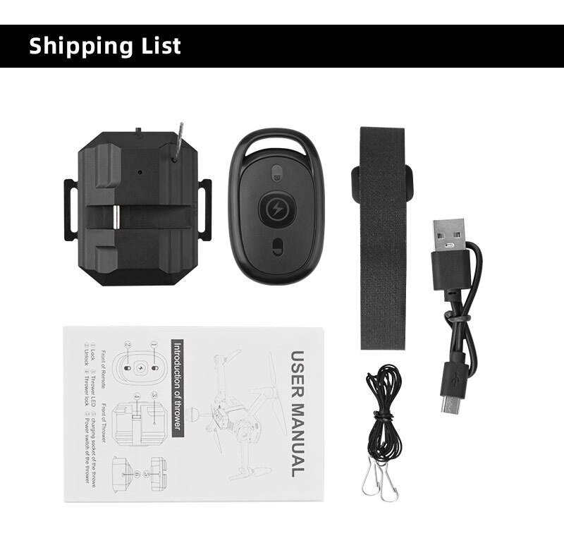 1. Drone thrower, which can be delivered remotely, is used for advertising, throwing bait, throwing gifts, delivering meals, giving wedding rings, etc;